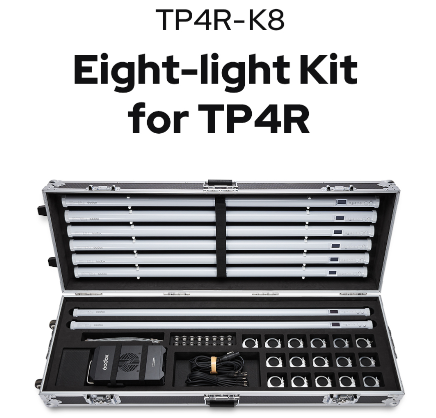 | TP4R-K8 | 8 × tubos TP4R (4′) + estuche rígido + TP-P600 power box | 8 × ≈47 W / 765 lux @ 1 m | RGBWW 2000–10 000 K | 32 píxeles por tubo, FX, control App/DMX/CRMX, IP65 |
