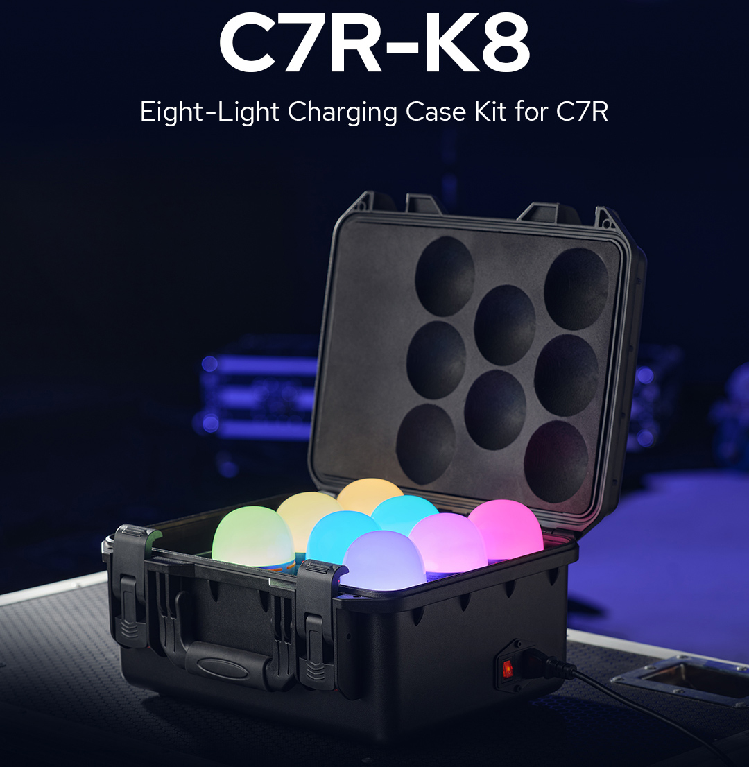 | C7R-K8 | 8 × bombillas C7R + estuche de carga | 8 × 10 W, 101 lux @ 1 m | RGBWW 2000–10 000 K | CRI 96 / TLCI 97–98, batería interna + USB-C/E27, estuche cargador, difusores cup bouncers |
